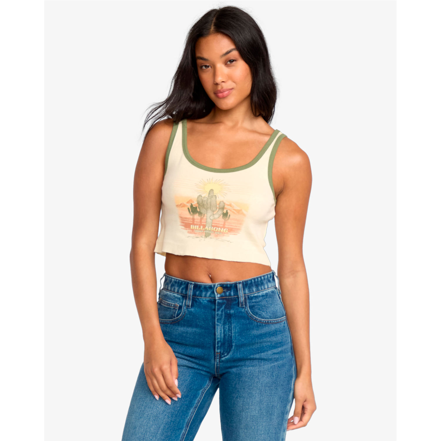 Bividi Para Mujer Sunset Break Tank Amarillo Billabong. El polo sin mangas para mujer Sunset Break es una prenda esencial para el sol, confeccionada en suave algodón acanalado. Nuestra camiseta de tirantes ajustada se adapta a la perfección. El cuello redondo y los detalles serigrafiados le dan un toque informal a tu armario de verano.