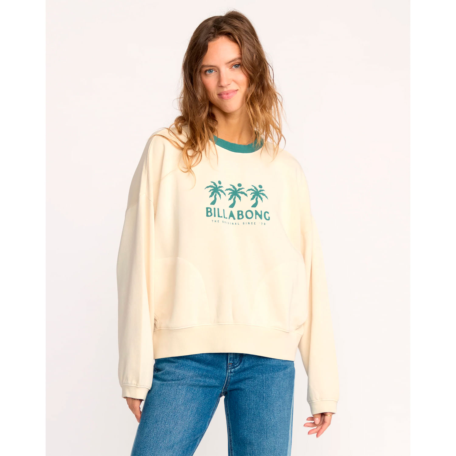 Polera Para Mujer Polera Triple Palms Crew Blanco Billabong. El polerón para mujer Triple Palms, está confeccionado en mezcla de algodón, ofrece un estilo relajado con su corte oversize y palmas serigrafiadas. Con bolsillos en las costuras y una banda de cuello en contraste, es perfecto para las noches frescas.
