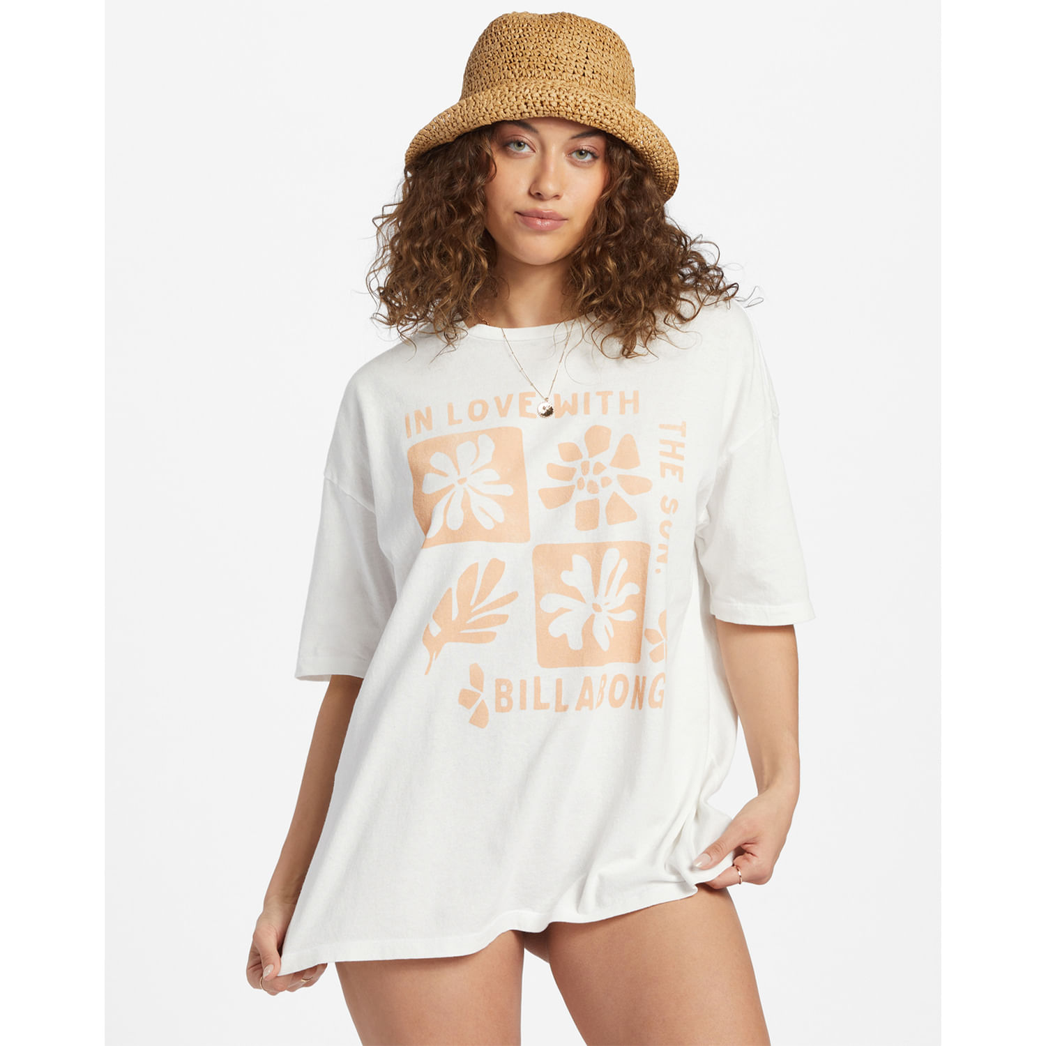 Polo Para Mujer Manga Corta In Love With The Sun Blanco Billabong. El polo para mujer In Love With The Sun tiene un ajuste relajado, presenta un diseño de cuello redondo confeccionada con tejido de punto de algodón suelto y teñido con pigmentos para darle un aspecto desgastado. Rematado con una serigrafía con tinta suave al tacto.